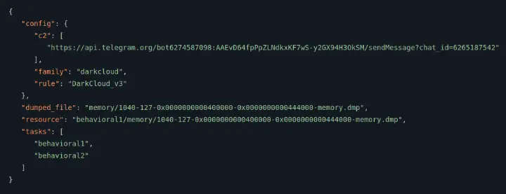En la siguiente captura se puede ver la configuración usada para el infostealer DarkCloud y como utiliza la API de Telegram para enviar las credenciales robadas a un canal controlado por los delincuentes.