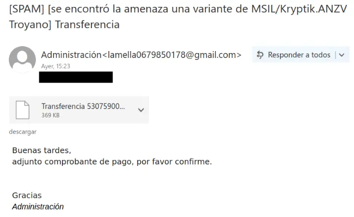 El caso que analizamos hoy corresponde a una campaña que se ha estado propagando recientemente y que utiliza un supuesto justificante de transferencia como cebo. El cuerpo del mensaje es escueto y solo indica al receptor del email que se adjunta un comprobante de pago en el fichero adjunto. Tampoco ayuda a la credibilidad del mensaje que no aparezcan logos de empresas ni firmas del remitente o, más importante aún, que la dirección desde donde se envía corresponda a una cuenta de Gmail.