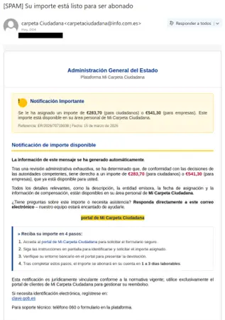 En un correo que se ha estado propagando durante los últimos días los delincuentes tratan de convencer a los usuarios (tanto empresas como particulares) de que se les ha concedido un abono por un valor interesante y que para reclamarlo solo deben acceder al área personal de “Mi Carpeta Ciudadana”.