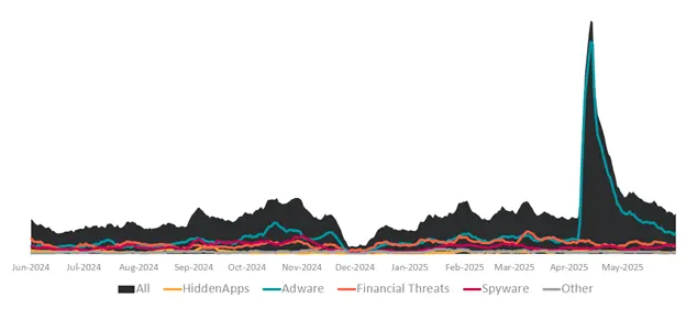 El adware, un software diseñado para mostrar anuncios no deseados en dispositivos móviles, se ha convertido en una de las amenazas más detectadas en Android. Según el último informe de amenazas de ESET, las detecciones aumentaron un 160 % en el primer semestre de 2025, consolidando al adware como un problema creciente para los usuarios españoles.