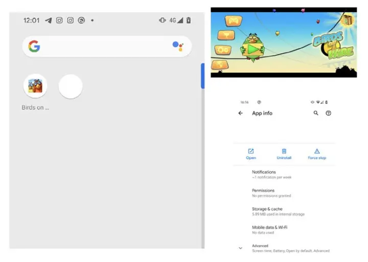Icono de la app señuelo (Birds on Wire) y el icono en blanco de su gemela. El icono de la app legítima lleva al juego (arriba a la izquierda) y el icono de la gemela lleva a info de la app (abajo a la izquierda)