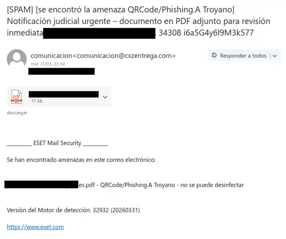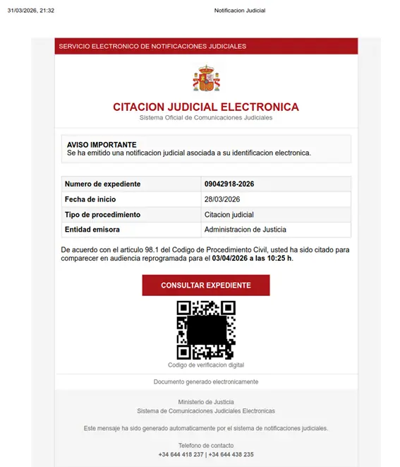 En el documento PDF adjunto podemos observar como aparece la supuesta notificación judicial a la que se hacía referencia en el asunto del correo, con el escudo de España bien visible, lo que denota cierta personalización de la campaña y unos objetivos claros como son los ciudadanos españoles. Además, se proporcionan tanto un enlace incrustado en el botón “Consultar expediente” como un QR para acceder a la supuesta citación.