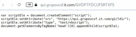 Dentro del fichero HTA, encontramos unas pocas líneas de código útil, ya que casi todo el archivo es relleno para ocultar una única acción real, que es cargar JavaScript remoto desde un dominio externo. También encontramos una firma codificada en, que parece un identificador o marcador interno más que contenido funcional del HTML.