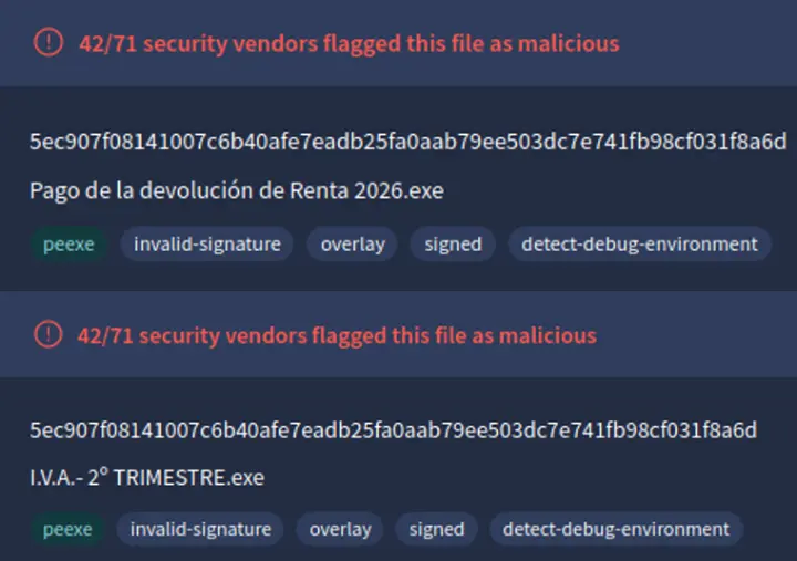 Esto se confirma al analizar los ficheros ejecutables que encontramos dentro de los archivos comprimidos y comprobar como, efectivamente, ambos tienen el mismo hash, lo que confirmaría que estamos ante la misma amenaza en ambos casos.