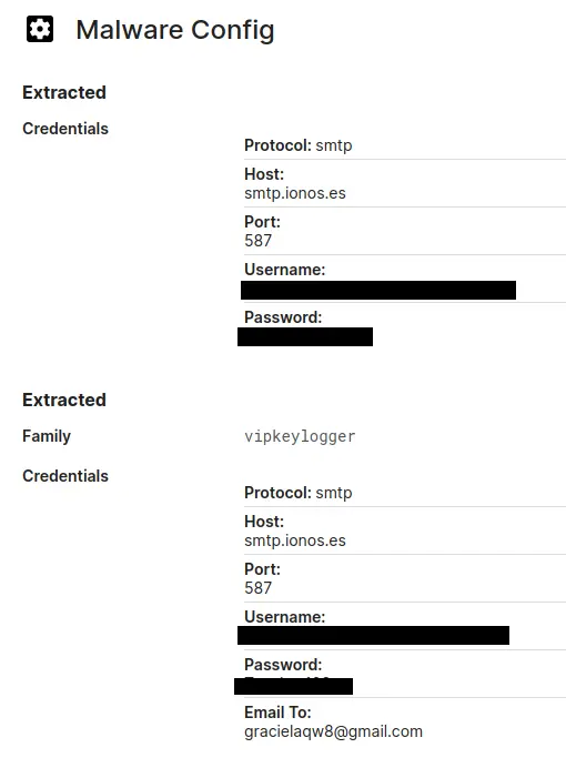 Una vez recopilada esta información, la amenaza procede a enviarla de vuelta al delincuente, para eso puede usar varias técnicas como enviarlas a servidores FTP, usar bots de Telegram o, como en este caso, usar un servidor de correo comprometido para enviar por email las credenciales robadas a un correo de Gmail.