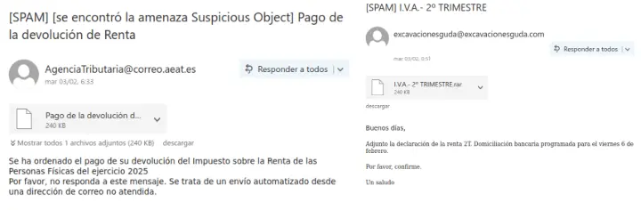 Sin embargo, esta no ha sido la única campaña que se ha estado propagando por España y que ha utilizado el pago de impuestos como cebo durante los últimos días. En nuestro laboratorio hemos analizado otros correos maliciosos que usaban asuntos como el pago de una supuesta devolución del impuesto sobre la renta o un pago relacionado con el IVA.