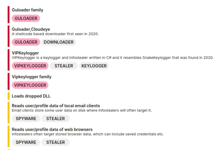 Al analizar esta amenaza de forma dinámica nos encontramos con viejos conocidos que llevan bastantes meses entre nosotros y con la finalidad de robar credenciales, especialmente de empresas, que son las principales receptoras de este tipo de mensajes. En concreto nos topamos con GuLoader (también conocido como CloudEye), un “cargador” de amenazas que suele ser responsable de desempaquetarlas y ejecutarlas en el sistema, y con el ladrón de información especializado en el robo de credenciales Snake/VIP Keylogger como carga maliciosa.