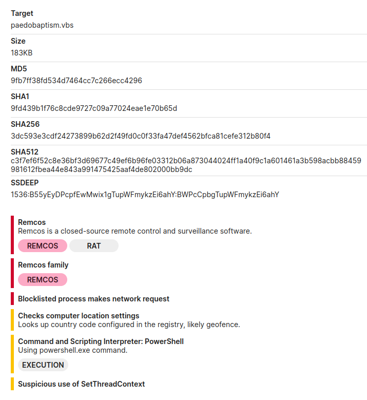 Es en esta segunda fase cuando comprobamos ante que tipo de amenaza estamos, siendo una herramienta de control remoto (RAT por sus siglas en inglés) muy conocida y de nombre Remcos. En esta ocasión parece que los delincuentes han optado por una herramienta con más capacidades que las que tiene un infostealer, ya que Remcos, una vez el sistema de la víctima ha sido comprometido permite al atacante tomar el control total del dispositivo.