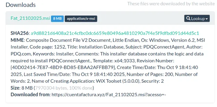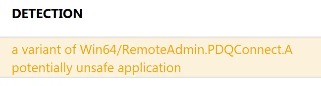 Tras revisar el fichero descargado comprobamos como no se trata de un código malicioso si no del instalador de la aplicación PDQ Connect, usada para acceder remotamente a sistemas. Este tipo de aplicaciones se usan de forma legítima en entornos corporativos para conectarse a equipos remotamente y solucionar incidencias o instalar nuevas aplicaciones, por ejemplo.