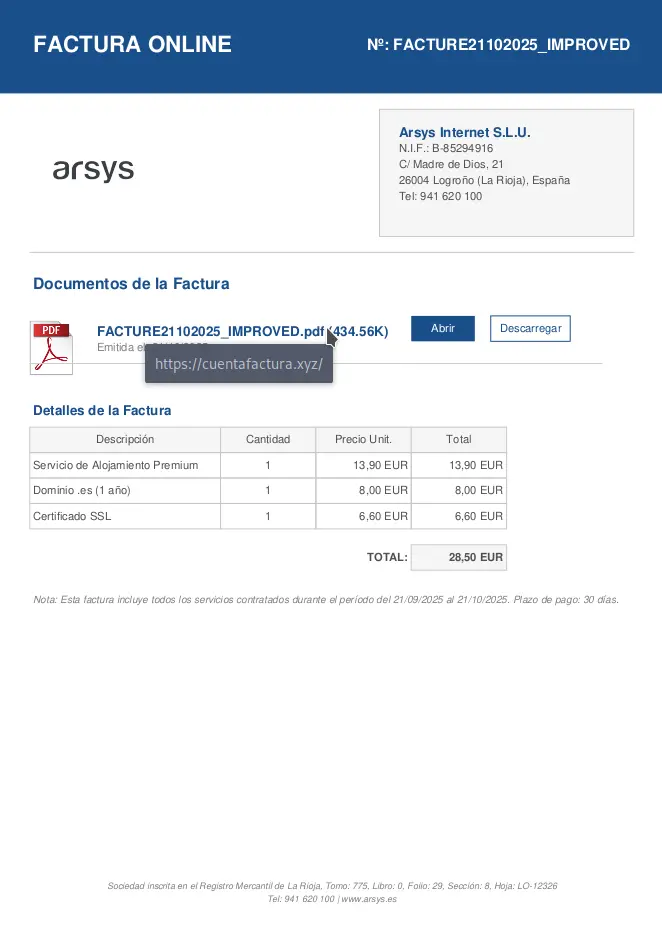 Como podemos observar, el correo está bien redactado, sin faltas de ortografía y hace referencia a un servicio de renovación de un dominio, de ahí que los delincuentes hayan decidido suplantar la identidad de una reconocida empresa española especializada en ofrecer estos servicios. Si observamos el remitente veremos como no aparente tener ninguna relación con Arsys, pero el dominio usado puede hacer pensar a quien lo reciba que se trata de un servicio de factura electrónica.