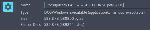 En esta ocasión, observamos como se ha utilizado una doble extensión para hacer creer a la víctima que está abriendo un archivo PDF cuando, en realidad, se trata de un fichero ejecutable.