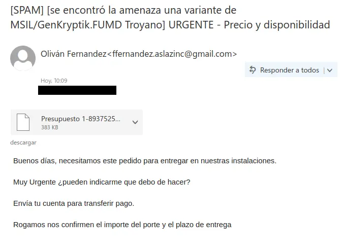 A simple vista, el siguiente correo no destaca de los otros muchos que se analizan diariamente suplantando a empresas y particulares y que intentan engañar al destinatario del mensaje para que abra el fichero adjunto. Como es de esperar, este tipo de emails suelen dirigirse a departamentos de administración y contabilidad de las empresas, acostumbradas a lidiar con un elevado volumen de correos parecidos, lo que provoca que los usuarios responsables de atenderlos bajen la guardia y sean una presa fácil para los delincuentes.