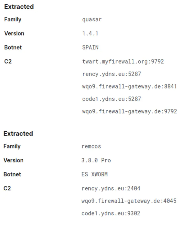 De todas estas muestras de malware hay dos en concreto que nos han llamado la atención al revisar la configuración que incluían para comunicarse con los centros de mando y control (C&C). Tal y como podemos observar en la captura de pantalla a continuación, tanto Quasar como Remcos tienen asignadas una botnet específica para España, algo nada extraño si tenemos en cuenta la cantidad y la frecuencia de las campañas de este estilo dirigidas a nuestro país.