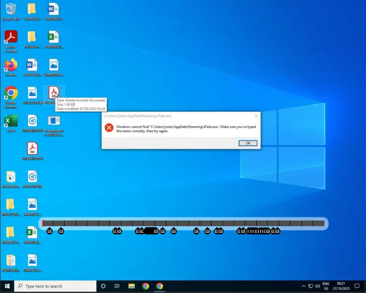 La utilización de múltiples amenazas con una finalidad muy similar tampoco parece la mejor estrategia, puesto que algunas de ellas podrían interferir entre sí, además de aumentar las probabilidades de ser detectadas por las soluciones de seguridad. Es por eso, y por otros detalles como la descarga de un archivo malicioso adicional de nombre iPads.exe que provoca un error visible para la víctima al tratar de ejecutarse, que posiblemente estemos ante una campaña preparada por cibercriminales con poca experiencia o escasas habilidades, ya que no se preocupan de optimizar sus campañas para conseguir el mayor número de víctimas posibles.