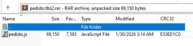 Aun con este error cometido por los delincuentes, es bastante probable que más de un usuario proceda a abrir el fichero adjunto al mensaje, ya sea por ser proveedor de ese ayuntamiento o por simple curiosidad. Si ese es el caso, se encontrarán un archivo JavaScript en lugar del pedido en formato ofimático esperado, tal y como puede verse a continuación: