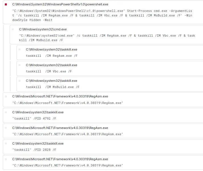 Si, además, procedemos a ejecutar el script en un entorno controlado y monitorizamos todas las acciones que realiza podremos comprobar como primero se lanzan varios procesos del sistema relacionados con la compilación de códigos para luego finalizarlos. Concretamente, el comando fuerza el cierre de tres procesos específicos: