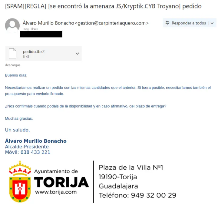 Si revisamos el correo observamos como se hace referencia a un supuesto pedido solicitado por el ayuntamiento de esta localidad, con un correo bien redactado, sin errores gramaticales ni de ortografía y proporcionando todos los datos de contacto, incluidos los del alcalde. El correo podría pasar por legítimo para muchos de los usuarios que lo reciban, pero los delincuentes han cometido un error al no camuflar la dirección del remitente y utilizar un email (posiblemente comprometido previamente) de un comercio que nada tiene que ver con el del ayuntamiento.