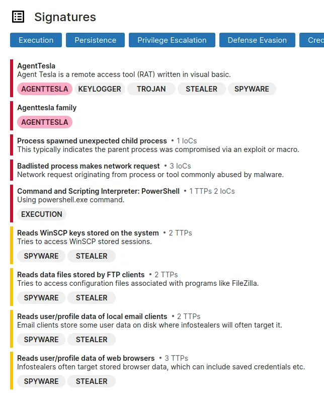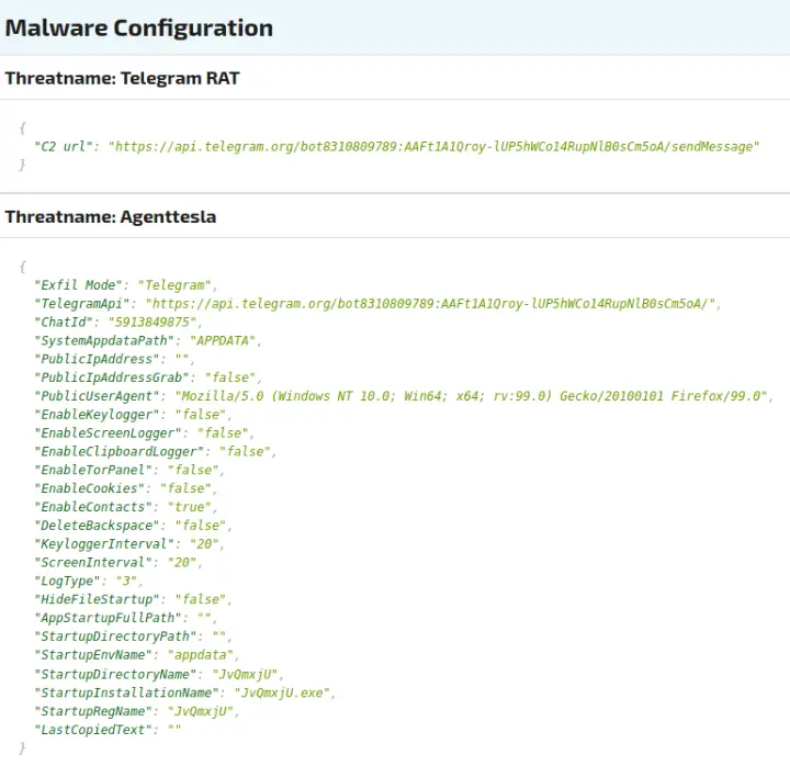 Una vez realizada esta tarea, se procede a descargar y ejecutar el payload final de la cadena de infección que, en esta ocasión se trata de un viejo conocido como es el ladrón de información Agent Tesla. Este infostealer también dispone de capacidades de acceso remoto configurado para exfiltrar datos a través de un bot de Telegram y se especializa, como muchas otras amenazas similares, en el robo de todo tipo de credenciales.