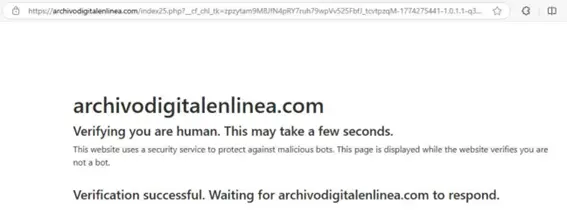 Un detalle interesante de esta campaña y que ya hemos visto en ocasiones anteriores es que, antes de proceder con la descarga del fichero se nos solicita que resolvamos un proceso de verificación para descartar bots. Esto suelen usarlo los delincuentes para evitar sistemas automatizados de detección y análisis de amenazas, consiguiendo así que sus campañas permanezcan activas más tiempo.