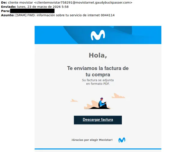 Una nueva campaña de phishing utiliza el nombre de la empresa de telecomunicaciones Movistar, intentando convencer a sus víctimas para que pulsen en un enlace relacionado con una supuesta factura. Aunque esta técnica es usada constantemente por los delincuentes desde hace muchos años, no por eso ha dejado de ser efectiva.